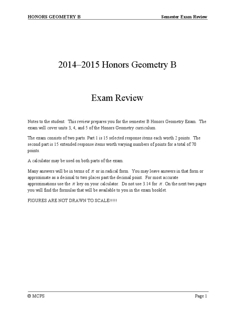 The test will be a mixture of multiple choice, free response, and proofs. Three parallel lines are coplanar. Things to note about this review and the final exam: Surface area and volume of solids 59. Exam review materialspdf geometry honors semester 1 name: